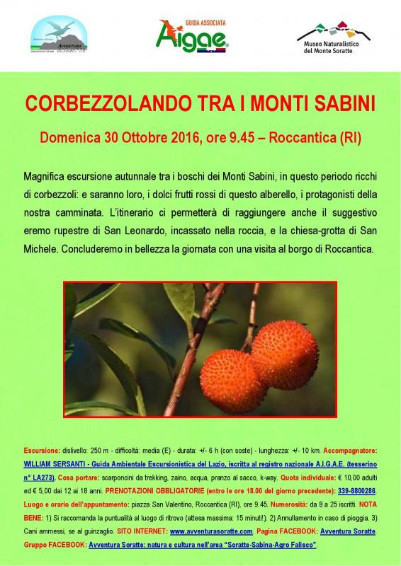 Magnifica escursione autunnale tra i boschi dei Monti Sabini, in questo periodo ricchi di corbezzoli: e saranno loro, i dolci frutti rossi di questo alberello, i protagonisti della nostra camminata. L’itinerario ci permetterà di raggiungere anche il suggestivo eremo rupestre di San Leonardo, incassato nella roccia, e la chiesa-grotta di San Michele. Concluderemo in bellezza la giornata con una visita al borgo di Roccantica.