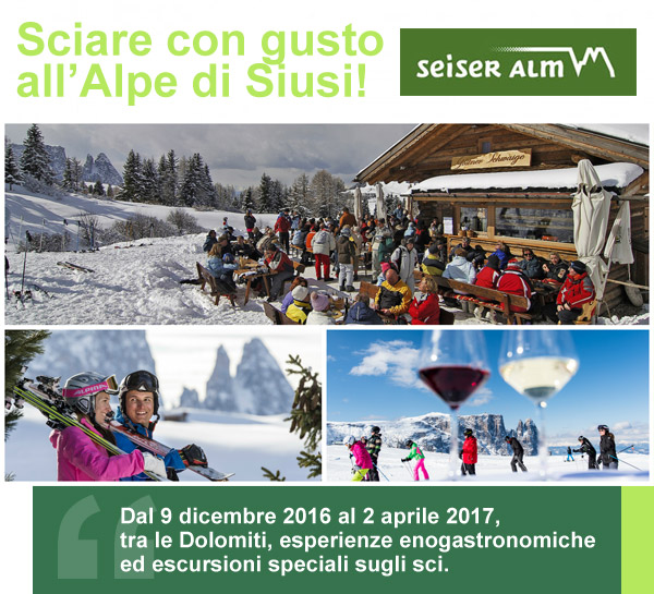 Scivolare giù per le vette dell’area vacanze Alpe di Siusi (Seiser Alm/Südtirol) - www.seiseralm.it/it/inverno-alto-adige/sci.html - non è solo un’emozionante esercizio al cospetto delle Dolomiti innevate (Patrimonio Mondiale UNESCO), ma anche un’esperienza super gustosa. Dal 9 dicembre 2016 al 2 aprile 2017, sciatori e appassionati di sport sulla neve possono partecipare alla Ski Experience Alto Adige, godendo non solo dell’entusiasmo di sciare tra i 60 km di piste dell’area sciistica Alpe di Siusi/Val Gardena e di fare salti tra le oltre 70 strutture del pluripremiato Alpe di Siusi Snowpark, ma anche del privilegio di partecipare a deliziose esperienze gastronomiche ed escursioni speciali.