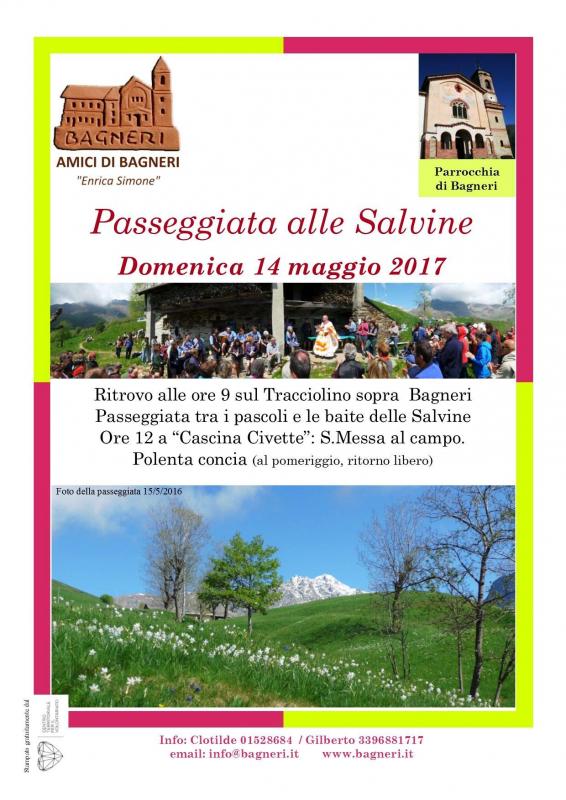 Ritrovo alle ore 9 sul Tracciolino sopra Bagneri, faremo una bella escursione di un paio d'ore tra i prati fioriti delle Salvine sopra Bagneri, raggiungendo una cascina ospitale. Lì alle 12 sarà celebrata la Santa Messa e distribuita la polenta.