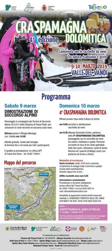 La quarta edizione di CraspaMagna Dolomitica vi aspetta a Canal San Bovo Domenica 10 Marzo 2019; due giorni con le racchette da neve, tra natura e gastronomia, alla scoperta della Valle del Vanoi, uno dei luoghi più affascinanti e incontaminati del Trentino.