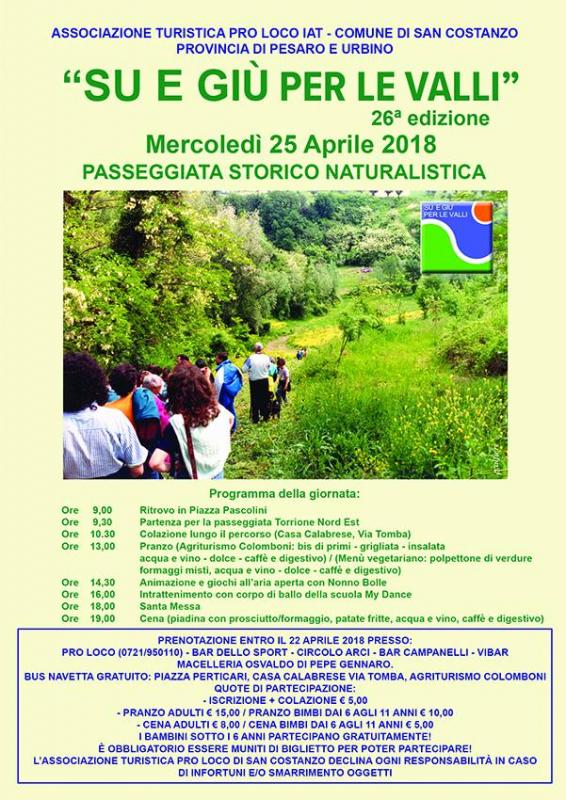 L'Associazione Turistica Pro Loco IAT di San Costanzo con il Comune di San Costanzo e la Provincia di Pesaro e Urbino sono lieti di proporvi per la giornata del 25 aprile la piacevole passeggiata storico naturalistica "SU E GIU' PER LE VALLI" che quest'anno giunge alla sua 26a edizione. Un appuntamento da non perdere!