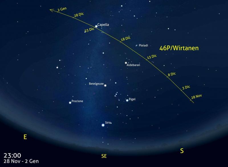 la Cometa 46/P Wirtanen è attesa con trepidazione dagli astronomi e da tanti appassionati di astri. E’ già debolmente visibile nel cielo ma raggiungerà proprio sabato 15 dicembre la massima vicinanza alla terra ( 11 milioni di chilometri) e, quindi, si spera , anche la massima luminosità con la possibilità di essere sorpresi anche dal passaggio di stelle cadenti dello sciame delle Geminidi. Bisogna puntare lo sguardo verso su/sud-est ed individuare la costellazione di Orione, dalla caratteristica forma di clessidra.
