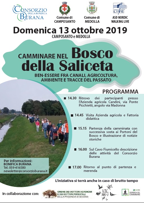 Dopo il successo dell'anno scorso, ritorna la passeggiata organizzata dal Consorzio della Bonifica Burana in collaborazione con le amministrazioni comunali di Camposanto e Medolla e con il gruppo Nordic Walking Live Asd.