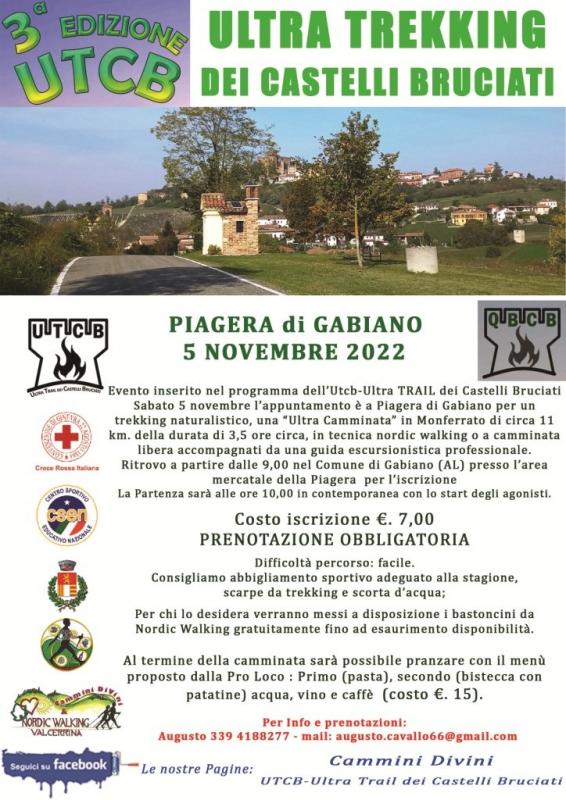Sabato 5 novembre l’appuntamento è a Piagera di Gabiano per un trekking naturalistico, una “Ultra Camminata” in Monferrato di circa 11 km. della durata di 3,5 ore circa, in tecnica nordic walking o a camminata libera accompagnati da una guida escursionistica professionale.