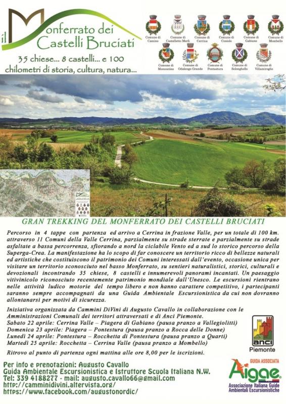 Il Gran Trekking del Monferrato dei Castelli Bruciati consiste in un percorso in 4 tappe con partenza ed arrivo a Cerrina in frazione Valle, per un totale di 100 km. attraverso 11 Comuni della Valle Cerrina, principalmente su strade sterrate e parzialmente su strade asfaltate a bassa percorrenza, sfiorando a nord la ciclabile Vento ed a sud lo storico percorso della Superga-Crea. La manifestazione ha lo scopo di far conoscere un territorio ricco di bellezze naturali ed artistiche che costituiscono il patrimonio dei Comuni interessati dall’evento, occasione unica per visitare un territorio sconosciuto ai più nel basso Monferrato, su sentieri naturalistici, storici, culturali e devozionali incontrando lungo il percorso 35 chiese, 8 castelli e innumerevoli panorami incantati e un paesaggio vitivinicolo riconosciuto recentemente patrimonio mondiale dall’Unesco. Le escursioni rientrano nelle attività ludico motorie del tempo libero e non hanno carattere competitivo, i partecipanti saranno sempre accompagnati da una Guida Ambientale Escursionistica da cui non dovranno allontanarsi per motivi di sicurezza. Iniziativa organizzata da Cammini DiVini di Augusto Cavallo (Guida Escursionistica professionale) in collaborazione con le Amministrazioni Comunali dei territori attraversati.