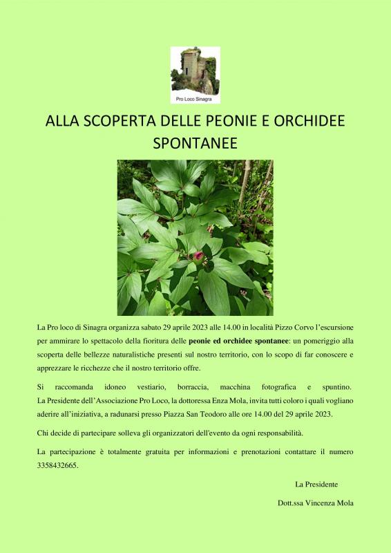 La Pro loco di Sinagra organizza sabato 29 aprile 2023 alle 14.00 in località Pizzo Corvo l’escursione per ammirare lo spettacolo della fioritura delle peonie ed orchidee spontanee: un pomeriggio alla scoperta delle bellezze naturalistiche presenti sul nostro territorio, con lo scopo di far conoscere e apprezzare le ricchezze che il nostro territorio offre.
