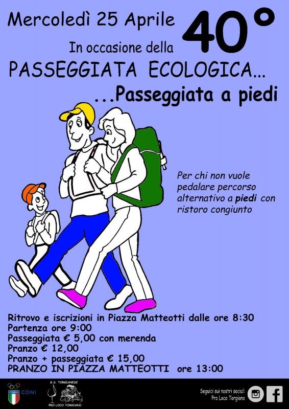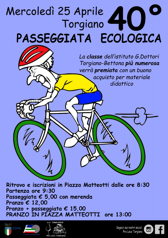 (AVInews) – Torgiano, 23 apr. – Torna a Torgiano l’appuntamento con la ‘Passeggiata ecologica’ giunta quest’anno alla 40esima edizione. In scena mercoledì 25 aprile, la storica e tradizionale gita ciclistica è organizzata dalla Pro Loco Torgiano in collaborazione con il Gruppo sportivo torgianese. Dalle 8.30 in piazza Matteotti il ritrovo dei partecipanti che vorranno iscriversi, mentre la partenza è prevista alle 9.30. La passeggiata permetterà di percorrere l’itinerario che abbraccia gran parte delle zone di campagna e del verde di Torgiano. Il percorso, adatto a persone di tutte l'età, prevede a metà tragitto la consueta sosta. Per concludere l’escursione, chi vorrà, avrà la possibilità di fermarsi a pranzo in piazza Matteotti alle 13.