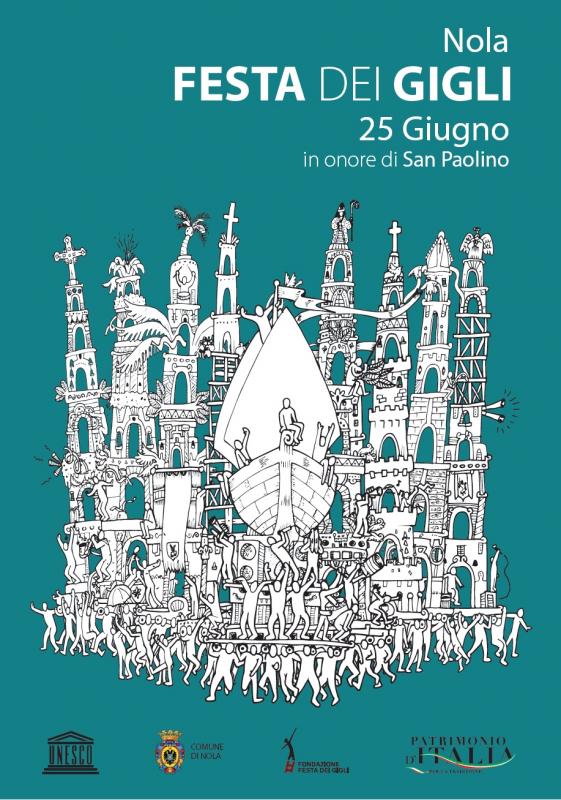 La Festa dei Gigli si celebra la domenica successiva al 22 giugno, giorno in cui si ricorda San Paolino, Vescovo della città nel 409 in onore del quale si perpetua questa artistica tradizione. La Festa, il cui ciclo preparatorio dura un anno intero, consiste in una vivace processione per le vie della città degli 8 Gigli e della Barca, simbolico omaggio della comunità al Santo Patrono. I Gigli sono delle strutture lignee alte 25 metri e rivestite in cartapesta che vengono trasportate sulle spalle dei nolani per mezzo di lunghe assi di legno. Questa manifestazione, alla quale partecipa attivamente l’intera città, coinvolta nell’organizzazione, nella costruzione, nel trasporto delle 9 macchine da festa, è un evento unico al mondo, che combina fede, arte, convivialità, fatica ed euforia. Nel 2013 la Festa dei Gigli è stata riconosciuta dall’Unesco patrimonio immateriale dell’umanità.