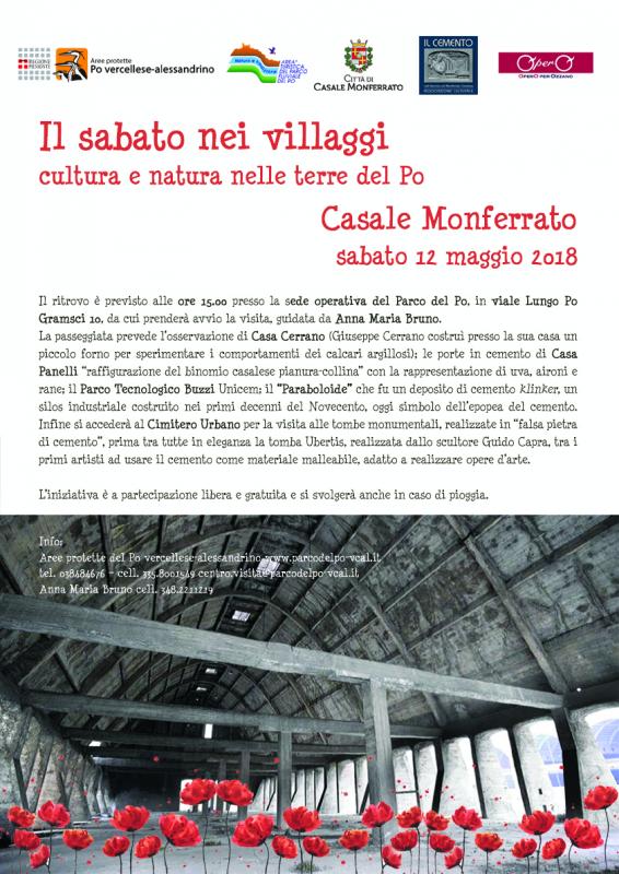 La passeggiata prevede l’osservazione di Casa Cerrano (Giuseppe Cerrano costruì presso la sua casa un piccolo forno per sperimentare i comportamenti dei calcari argillosi); le porte in cemento di Casa Panelli: “raffigurazione del binomio casalese pianura-collina” con la rappresentazione di uva, aironi e rane; il Parco Tecnologico Buzzi Unicem; il “Paraboloide” che fu un deposito di cemento klinker, un silos industriale costruito nei primi decenni del Novecento, oggi simbolo dell’epopea del cemento. Infine si accederà al Cimitero Urbano per la visita alle tombe monumentali, realizzate in “falsa pietra di cemento”, prima tra tutte in eleganza la tomba Ubertis, realizzata dallo scultore Guido Capra, tra i primi artisti ad usare il cemento come materiale malleabile, adatto a realizzare opere d’arte.