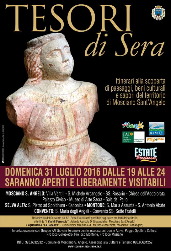 MOSCIANO SANT’ANGELO - Domenica 31 luglio il Comune di Mosciano promuove “Tesori di Sera”: dalle ore 19 fino alle 24 itinerari liberi alla scoperta di beni culturali, paesaggistici e sapori del territorio.