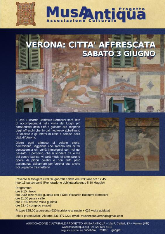 Il Dott. Riccardo Battiferro Bertocchi sarà lieto di accompagnarvi nella visita dei luoghi più caratteristici della città e guidarvi alla scoperta degli affreschi che fin dal medioevo abbellivano le facciate e gli interni di case e palazzi della città di Verona.Dietro ogni affresco si celano storie, committenti, leggende che saremo lieti di far conoscere a chi vorrà immergersi con noi nel passato.Il percorso, che si snoderà tra le vie del centro storico, vi darà modo di ammirare le opere di pittori celebri e non, tutti però accomunati dall'amore per Verona che anche noi vogliamo trasmettervi.