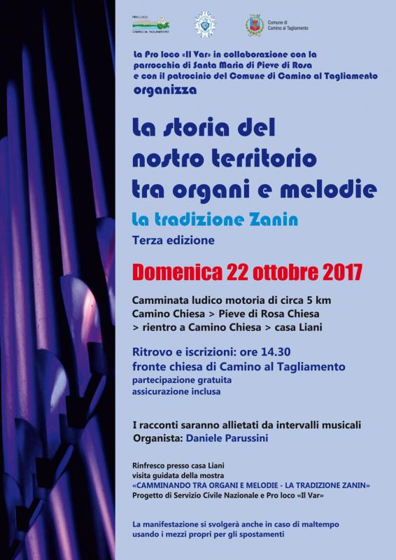 La storia del nostro territorio - III edizione Tra organi e melodie: la tradizione Zanin Domenica 22 ottobre 2017 Camminata ludico motoria di circa 5 km Camino Chiesa > Pieve di Rosa Chiesa > rientro a Camino Chiesa > casa Liani Ritrovo e iscrizioni: ore 14.30 fronte chiesa di Camino al Tagliamento Partecipazione gratuita I racconti saranno allietati da intervalli musicali Organista: Daniele Parussini Rinfresco presso casa Liani