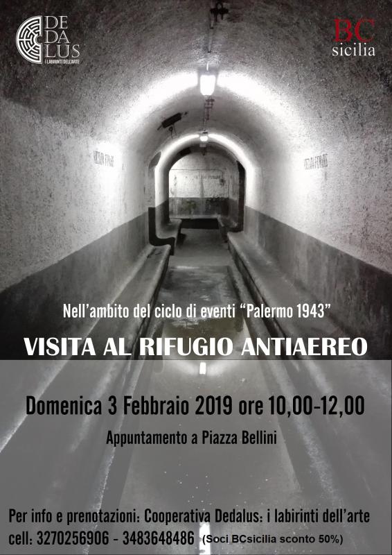 “Palermo 1943” inizia con la visita al rifugio antiaereo di piazza Pretoria, ricavato in periodo bellico sfruttando alcuni cunicoli ipogei già esistenti sotto il Palazzo delle Aquile. Il ricovero, pensato per circa 200 persone, aveva originariamente tre ingressi: due ai lati dei leoni lapidei che fronteggiano la via Maqueda ed uno nell’androne del palazzo comunale, da cui avviene l’accesso ancora oggi. Il rifugio, ancora intatto, si sviluppa in una serie di lunghi corridoi, delimitati da sedili in pietra. La visita sarà guidata dall’esperto di storia Wilfried Rothier e sarà accompagnata dalla narrazione di alcuni racconti “della nonna”, che faranno rivivere, tra sorrisi e lacrime, le atmosfere di quel tormentato periodo storico.