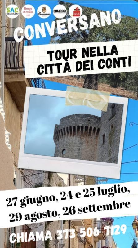 Durante i tour “incontriamo” il Castello, la Cattedrale, i Palazzi, le Torri, le campagne, l’arte rurale per un connubio perfetto tra arte, storia, gastronomia, cultura, ambiente che fanno di Conversano una città ideale per tutti. Il timone sarà affidato ad un team di esperti appassionati della città con l’obiettivo chiaro e definito di far visitare Conversano ai turisti che giungono da lontano ma anche ai nostri stessi cittadini ed ai vicini di casa dei comuni limitrofi e magari agli immigrati che tornano per le vacanze ed hanno voglia di “riassaporare, rivivere” la propria cara vecchia città di origine.