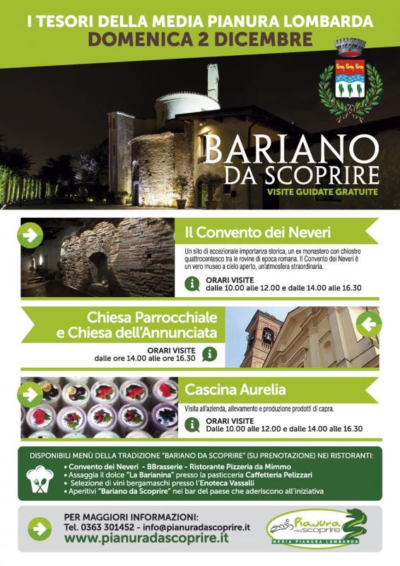 L’iniziativa “Bariano da scoprire” è una proposta dell’associazione Pianura da scoprire, associazione di riferimento per la promozione turistica e territoriale della media pianura lombarda che raccoglie una cinquantina di comuni nelle province di Bergamo, Cremona e Milano. Questo nuovo “format” rappresenta un’iniziativa pilota che l’associazione intende estendere e sviluppare nel corso del 2019 in collaborazione con i tanti comuni della media pianura, i quali racchiudono spesso importanti eccellenze in vari settori, che risultano però poco conosciute ai più. Obiettivo dichiarato: rendere questo territorio una metà di interesse turistico con attrattive naturali, storico-artistiche, gastronomiche e culturali fruibili e adatte per i pubblici più diversi.