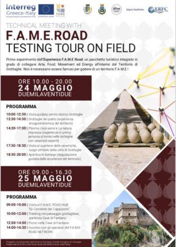 Il 24 maggio 2022, dalle ore 10 alle ore 20, si terrà il Tour Testing incentrato sui pilastri Food ed Art del progetto F.A.M.E. Road. La prima giornata del Tour Testing porterà i visitatori alla scoperta del centro storico di Grottaglie e del Quartiere delle Ceramiche, luogo simbolo della città, con una guida certificata della startup Destinazione Puglia. Questa piacevole passeggiata sarà accompagnata da deliziose soste culinarie presso Vineria a Sud e sulla terrazza della bottega delle Ceramiche D'Arte Carmelo Carriero che prevederanno assaggi di prodotti tipici locali a km zero ed incentrati sul concetto di Dieta Mediterranea. A rendere unica questa prima giornata, sarà l'esperienza in bottega che permetterà ai visitatori di "toccare con mano" l'antica arte ceramica grottagliese, facendo loro creare, in prima persona, opere di artigianato locale grazie all'aiuto di ceramisti esperti (Francesco Carriero per quanto attiene il tornio ed Annamaria Quaranta per quanto riguarda la decorazione delle opere realizzate).