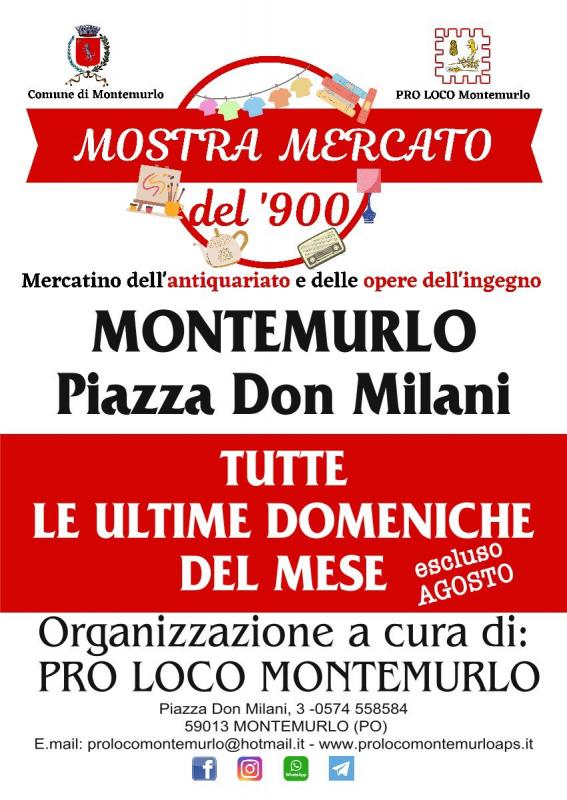 Da Novembre 2022 la Pro Loco di Montemurlo ha in gestione per conto del Comune di Montemurlo la Mostra Mercato ‘900 – Mercatino dell’antiquariato e delle opere dell’ingegno, che si tiene l’ultima domenica di ogni mese in Piazza Don Milani a Montemurlo dalle ore 9:00 alle 19:00.