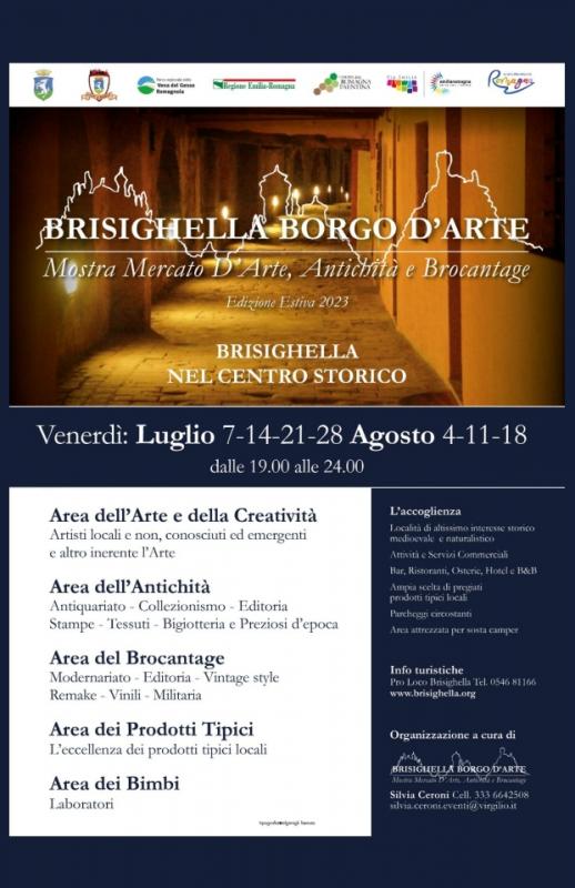 I venerdì 07/14/21/28 Luglio e 04/11/18 Agosto 2023 dalle ore 19.00 alle ore 24.00 – “Brisighella Borgo d’Arte”, in centro storico, mostra mercato, d’arte, antichità e brocantage.