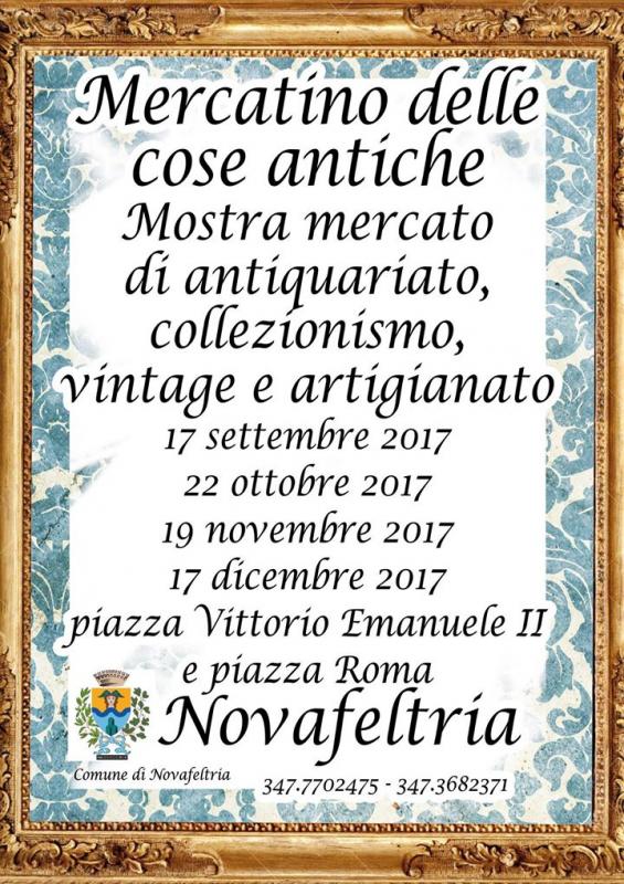 Ogni terza domenica del mese sino a dicembre 2017, nel centro storico di Novafeltria, in collaborazione con l'Amministrazione Comunale l'antico, il collezionismo e l'artigianato dalle ore 8:00 alle ore 20:00.