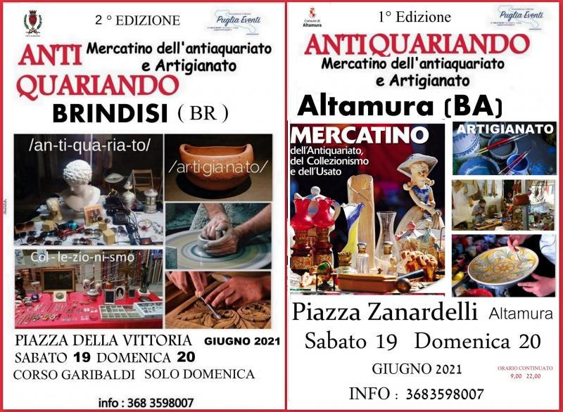 In Piazza Zanardelli ad Altamura in provincia di Bari si svolge nei giorni Sabato 19 e Domenica 20 Giugno 2021 la 1a edizione di Antiquariando, il Mercatino dell'Antiquariato e dell'Artigianato.