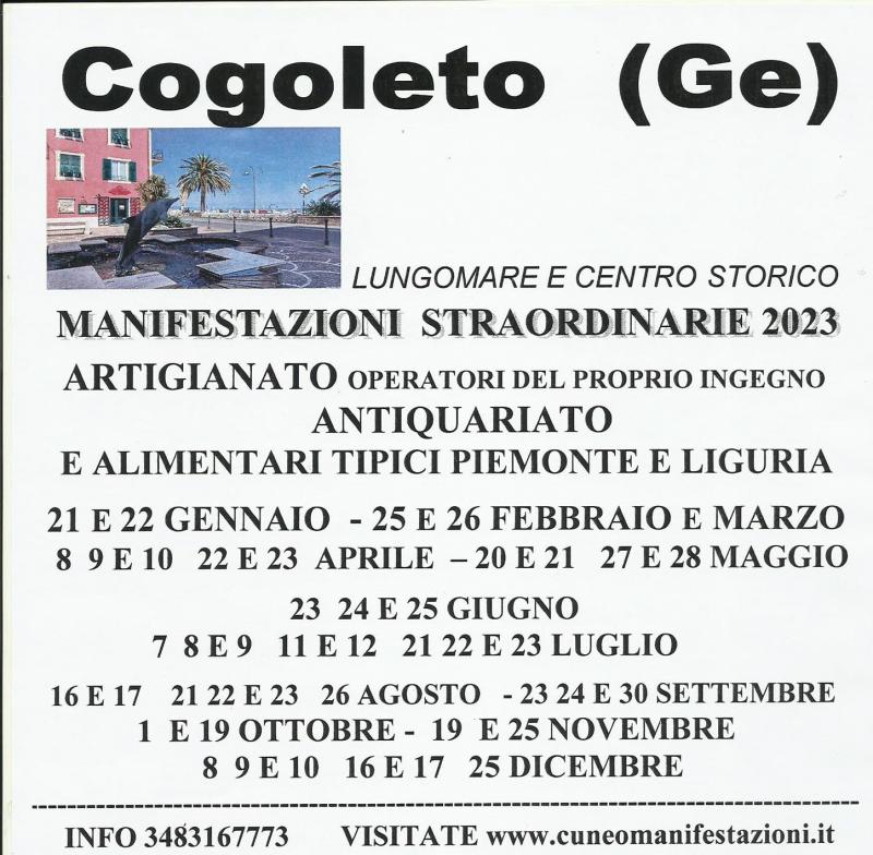 A Cogoleto in provincia di Genova si svolge il Mercatino dell'Antiquariato e Artigianato.e alimenti tipici di Liguria e Piemonte