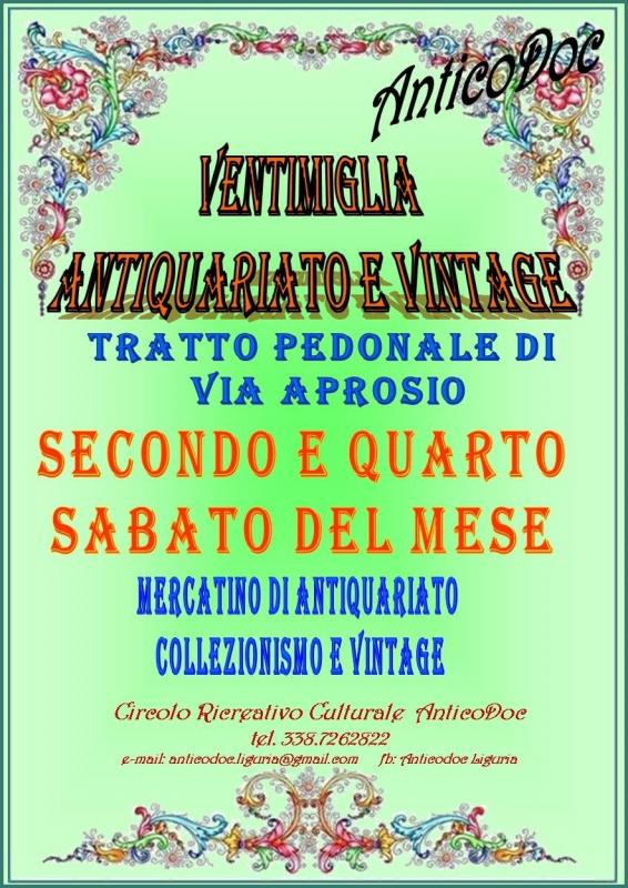 Presso il tratto pedonale di Via Aprosio a Ventimiglia in provincia di Imperia si svolge ogni secondo e quarto Sabato del Mese, dalle ore 08.00 alle ore 18.00, il mercatino d'antiquariato, collezionismo e vintage "Ventimiglia Antiquariato e Vintage".