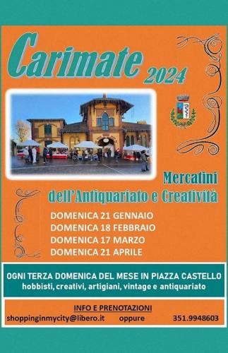In Piazza Castello a Carimate in provincia di Como si svolge nei giorni 21 Gennaio, 18 Febbraio, 17 Marzo, e 21 Aprile 2024 i Mercatini dell'Antiquariato e della Creatività.
