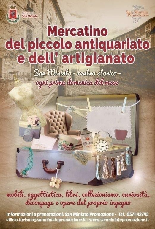 Come ogni prima domenica del mese torna anche questa Domenica il consueto appuntamento con il mercatino dell'Antiquariato e delle Arti e dei mestieri nel centro storico di San Miniato,dove Il fascino degli oggetti intriganti e desueti incontra l'originalità del piccolo artigianato e degli antichi mestieri. Si svolge in Piazza del Popolo, Piazza della Repubblica, Via Conti,corso Garibaldi e piazza Dante Alighieri dalle ore 8,00 alle 20,00.
