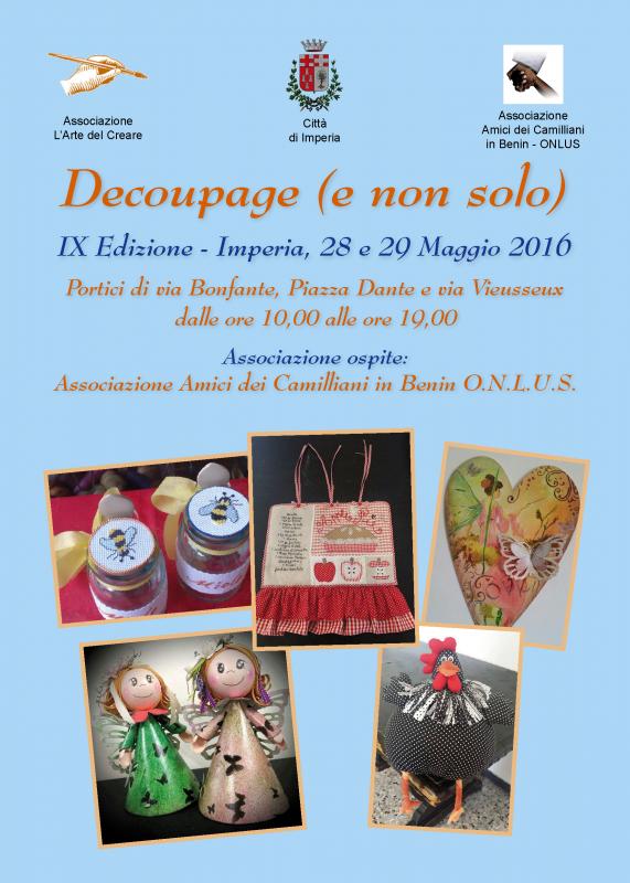 La manifestazione Decoupage (e non solo) nasce nel giugno 2008 per evidenziare l’importanza della creatività in ogni suo aspetto. L’evento, promozione di una mostra mercato con laboratori creativi, è organizzato dall’associazione L’Arte del Creare che vuole mettere in evidenza la creatività non solo in ambito hobbistico ma soprattutto in quello terapeutico, didattico e sociale. Attraverso l'uso dei materiali artistici, il processo creativo produce benessere, salute e migliora la qualità della vita.Con l'espressione artistica è possibile incrementare la consapevolezza di sé, fronteggiare situazioni di difficoltà, stress, esperienze traumatiche, migliorare le abilità cognitive e godere del piacere che la creatività artistica, affermando la vita, porta con sé.