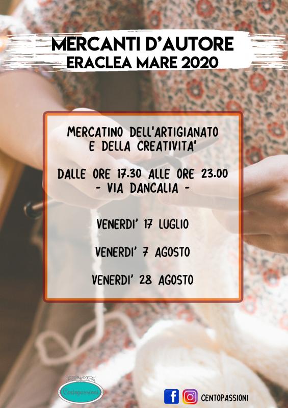 Ritorna in via Dancalia a Eraclea Mare "MERCANTI D' AUTORE" un evento riservato a creativi e makers che metteranno in mostra la loro capacità creativa lavorando sul posto e esponendo gli oggetti di loro produzione: borse, quadri, collane e orecchini, spille, cornici, saponi, magliette, capi di abbigliamento, lanterne ed altri oggetti in legno, cinture in pelle, calamite, oggettistica in fimo, orologi ricavati da vecchi vinili, cofanetti in legno lavorato, oggetti di arredamento in legno, ferro e pietra, sassi dipinti, lampade, penne, papillon in legno, oggetti in ceramica.