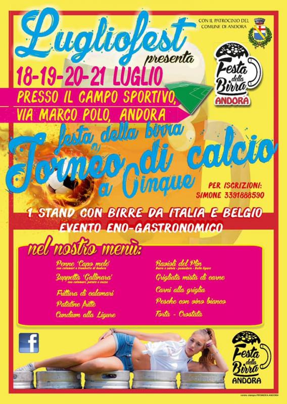 Ad Andora in provincia di Savona si svolge nei giorni dal 18 al 21 Luglio 2019 la Festa della Birra e il torneo di Calcio a 5.