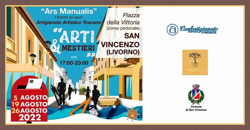 In Piazza della Vittoria a San Vincenzo in provincia di Livorno si svolge nei giorni 05, 19, 26 Agosto 2022, dalle ore 17.00 alle ore 23.00, il Mercatino dell'Artigianato Artistico Toscano "Arti e Mestieri".