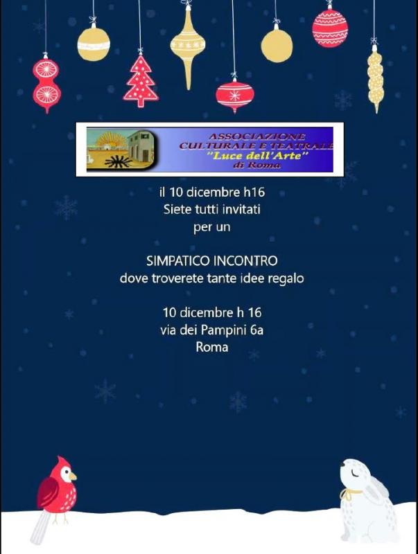 Il 10 Dicembre 2022 siete tutti invitati alle h 16 presso la sede operativa dell'Ass culturale e teatrale "Luce dell'Arte" ETS a Roma in via dei pampini, 6 A, zona Centocelle per venire a scovare tante sorprese per il Natale! Oggetti fantastici per i vostri regali, info al n 3481184968