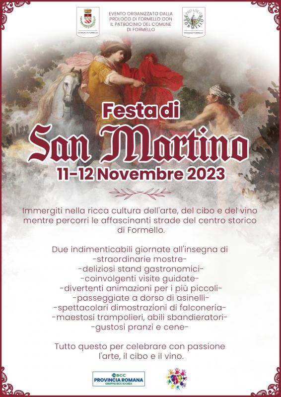 Sabato 11 e domenica 12 novembre 2023 torna l’appuntamento con la Festa di San Martino a Formello, manifestazione è dedicata alla cultura dell'arte, del cibo e del vino.