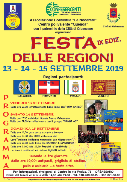Il 13, 14 e 15 settembre si terrà a Orbassano la IX^ edizione della FESTA DELLE REGIONI, a cura di Associazione Bocciofila “Le Nocerate” Centro polivalente “Quenda” con il patrocinio della Città di Orbassano.