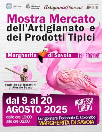 Torna a Margherita di Savoia in Puglia (BT), la “MOSTRA NAZIONALE DELL’ARTIGIANATO E DEI PRODOTTI TIPICI REGIONALI”, dal 09 al 20 Agosto 2025, con apertura solo serale dalle ore 19:00 alle ore 02:00 sul frequentatissimo lungomare pedonale Cristoforo Colombo.