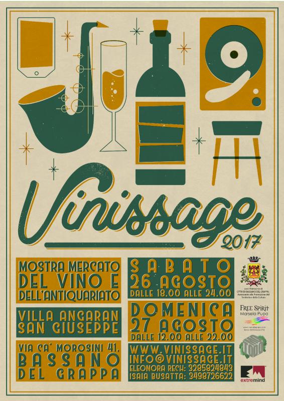 Vinissage però non è solo vino: durante tutto l’evento ci sarà un piccolo mercatino di antiquariato dove poter curiosare, vendere e acquistare oggetti antichi, moderni o semplicemente inutilizzati. Negli spazi della villa, inoltre, saranno esposte le opere di otto giovani artisti bassanesi, uno per ogni cantina, accompagnate dalle note della band Malus Antler il sabato sera, e del Faldani & Forestan Jazz Duo la domenica pomeriggio.Le cantine che partecipano all’evento sono: Società Agricola Siro Merotto, Cantina Ongaresca, Mettosantin, Azienda Agricola De Bacco, Azienda Agricola Campion, Ca' dei Giari, Alla Costiera, Terre dei Colli.
