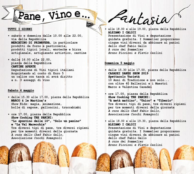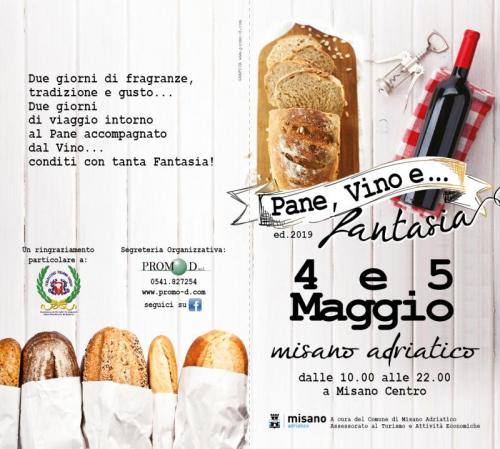 Con la collaborazione del Comune di Misano Adriatico, si svolgerà i giorni 4 e 5 maggio la 5^ edizione di “Pane, Vino e… Fantasia”, una manifestazione di tre giorni di viaggio intorno alle molteplici declinazioni di un alimento che unisce le culture di tutto il mondo. Il centro di Misano Adriatico si animerà con musica, balli popolari e della tradizione contadina. Inoltre incontri, mostre a tema, esposizione, degustazioni e laboratori per gli abbinamenti enologici in collaborazione con Cantine locali.