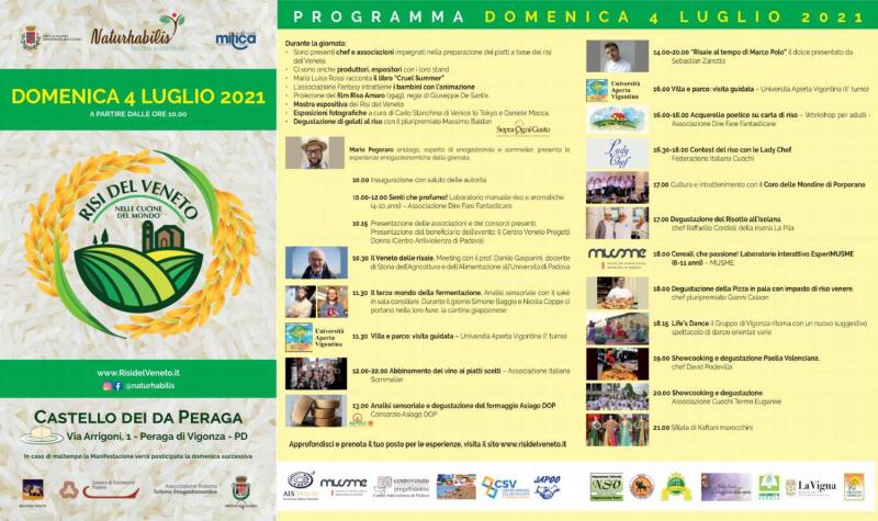 Il Comune di Vigonza (PD), l'Associazione Mitica, in collaborazione con l'Associazione Culturale NSV Organizzazione Eventi affiliata A.I.C.S. - Comitato Provinciale di Rovigo, organizzano per Domenica 04 Luglio 2021 a Peraga di Vigonza (PD), all'interno del Parco del Castello dei Da Peraga, in Via Arrigoni 1, il Mercatino della Manifestazione "Risi del Veneto nelle cucine del mondo", che prevede la presenza di Espositori delle Tradizioni Popolari, dell'Artigianato Artistico e delle Opere d'Ingegno Creativo con Idee Regalo per l'Estate, bancarelle di Prodotti Enogastronomici Tipici Regionali d'Italia e Specialità Alimentari Dolci e Salate Stagionali, Prodotti e Rimedi Naturali per la Cura del Corpo e del Vivere Sano.