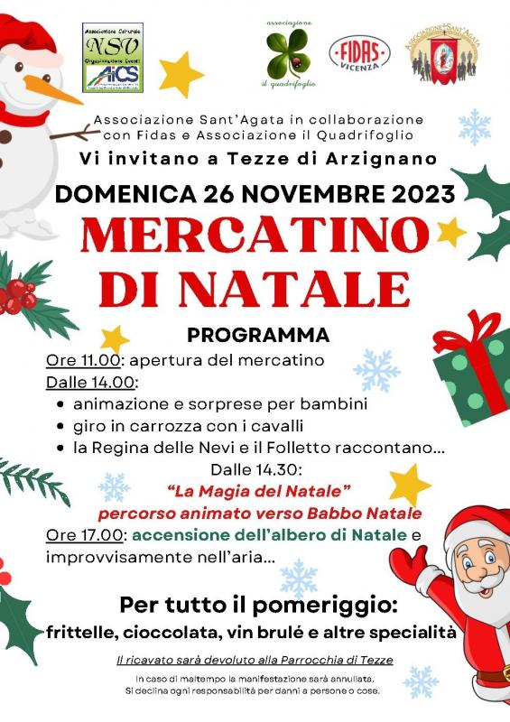 L'Associazione Culturale NSV Organizzazione Eventi APS affiliata A.I.C.S. - Comitato Provinciale di Rovigo, sarà presente in occasione del "Mercatino di Natale" nella giornata di Domenica 26 Novembre 2023, a Tezze di Arzignano (VI), in Via Roma, dalle ore 11:00 alle ore 19:00 con la rassegna dei Prodotti Enogastronomici Tipici Regionali ed Italiani con Degustazioni e Specialità Alimentari Dolci e Salate Stagionali prodotte artigianalmente per esaltare i Gusti e i Sapori di una tradizione antica ormai persa.Il programma della giornata prevede alle ore 11:00: apertura del Mercatino di Nataledalle ore 14:00: animazione e sorprese per bambini; giro in carrozza con i cavalli; la Regina delle Nevi e il Folletto raccontano...Dalle 14:30: "La Magia del Natale" percorso animato verso Babbo NataleAlle ore 17:00: accensione dell'albero di Natale e improvvisamente nell'aria...Per tutto il pomeriggio: Frittelle, Cioccolata, Vin Brulé e altre specialità.