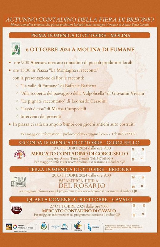 "Autunno Contadino a Molina di Fumane" che si terrà il 6 ottobre 2024, le altre tre domeniche di Ottobre il mercato contadino proseguirà nei borghi di Gorgusello, Breonio e Cavalo.