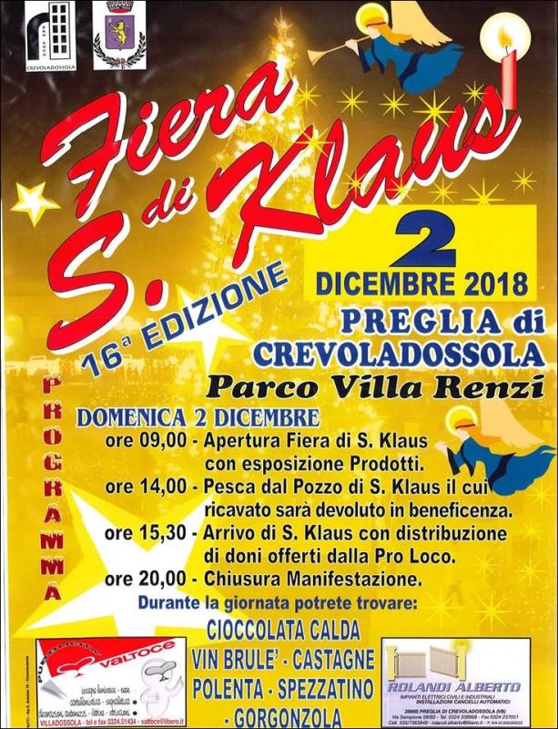 Domenica 02 Dicembre 2018 dalle ore 9:00 alle ore 20:00, presso il Parco di Villa Renzi a Preglia di Crevoladossola, Sedicesima Edizione della Fiera di S. Klaus.