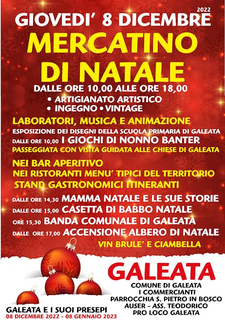 Mercatino di Natale a Galeata 8 dicembre 2022, laboratori musica animazione , stand gastronomici, casetta di babbo natale, accensione albero di natale.