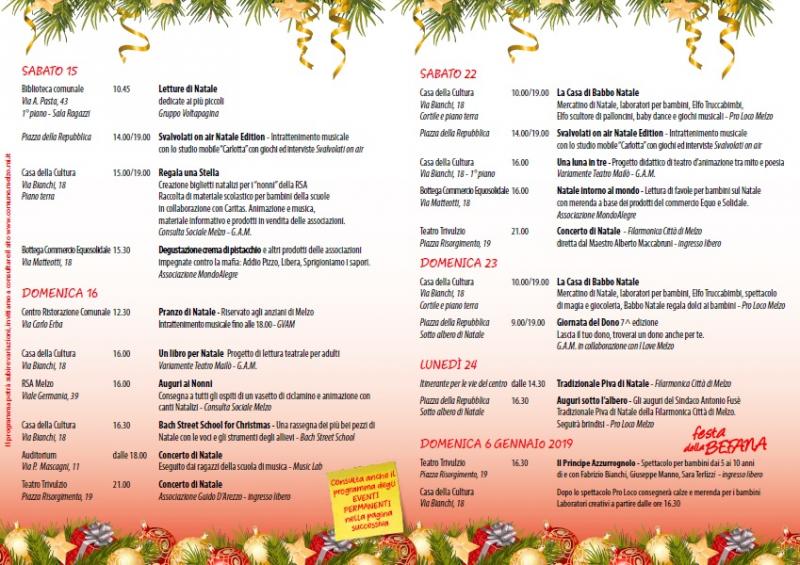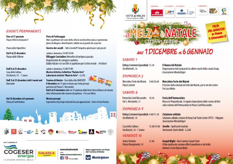 Fatevi incantare dalla magia del Natale con una serie di eventi, unici nel loro genere, che faranno di Melzo un punto di riferimento durante queste festività. L’Amministrazione Comunale e Pro Loco Melzo, con il sostegno di DAM (Distretto Attività Melzesi) e Confcommercio Melzo, hanno lavorato alla stesura di un programma ricco di cultura, tradizione, animazione e spettacoli, con la partecipazione di hobbisti e creativi. Moltissime anche le iniziative promosse dalle associazioni del territorio, finalizzate a rendere questo dicembre, per la gioia delle famiglie, originale ed esclusivo.