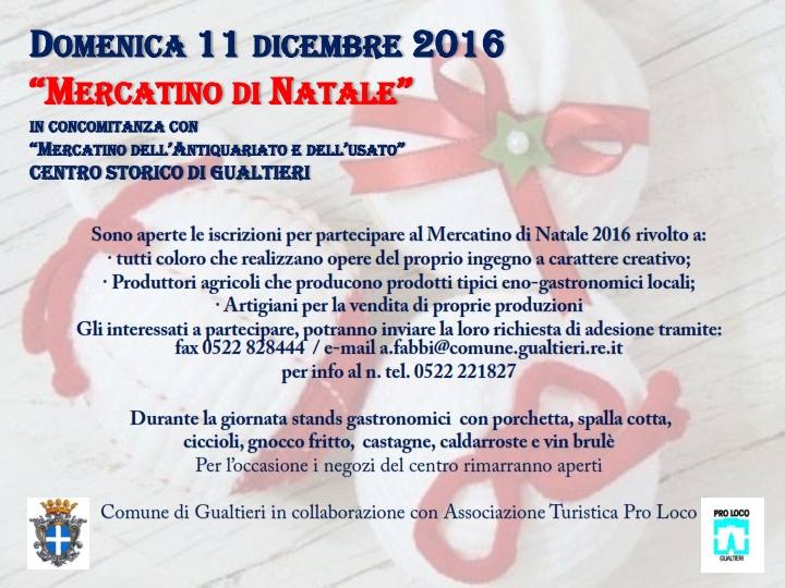 Domenica 11 dicembre 2016 a Gualtieri Mercatino di Natale con: decorazioni e addobbi di Natale, ricamo, découpage, hobbystica, dolciumi e prodotti enogastronomici locali, negozi aperti.