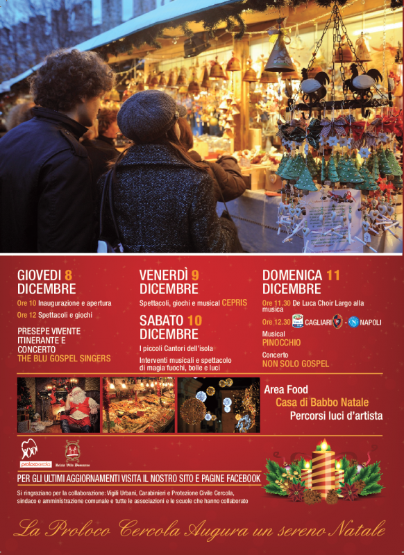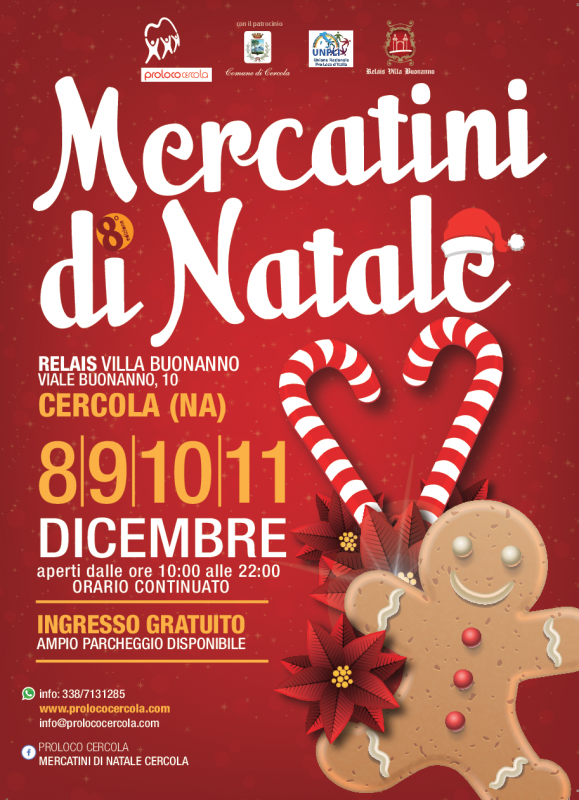 La proloco di Cercola organizza l'8 edizione dei mercatini di Natale presso Relais Villa Buonanno a Cercola. La fiera sara' aperta dal 8 al 11 dicembre con orario 10-22. Sono previsti concerti, spettacoli serali, musical e cori gospel; una casa di babbo natale e animazione itinerante per bambini e non solo. Luminarie e punti di ristorazione faranno da contorno ad un'atmosfera unica e magica.