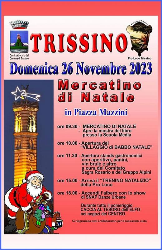 In Piazza Mazzini a Trissino in provincia di Vicenza si svolge nella giornata di Domenica 26 Novembre 2023 il Mercatino di Natale.