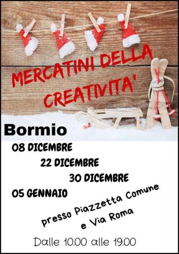 Anche quest’anno appuntamento con i mercatini della creatività: oggettistica e piccolo artigianato in centro a Bormio, nella parte bassa della via Roma/p.zza del comune ( ingresso del paese ).