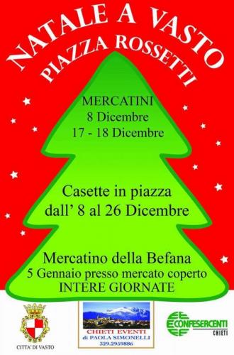 Dall’8 al 26 dicembre 2016 nel suggestivo centro storico di Vasto si terrà il mercatino di Natale. Tra le luci, i profumi ed i sapori delle feste, in una suggestiva atmosfera si potrà gironzolare tra tante casette in legno che propongono un’offerta varia di decorazioni tradizionali, oggetti da regalo, lavori artigianali e prodotti gastronomici.
