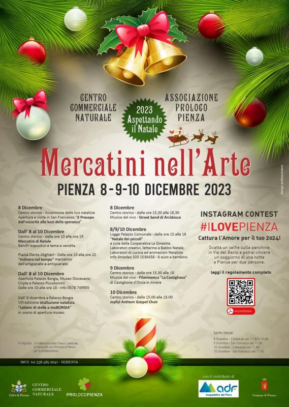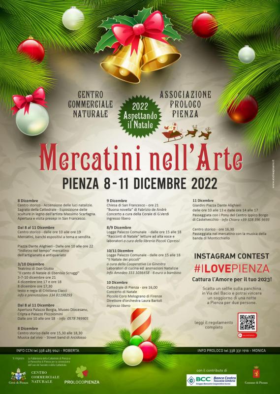 Dal 8 al 10 Dicembre 2023 a Pienza torna il Mercatino di Natale - Natale nell'Arte con banchi di artigianato locale nell'arte, musica, giochi e intrattenimenti per bambini.
